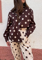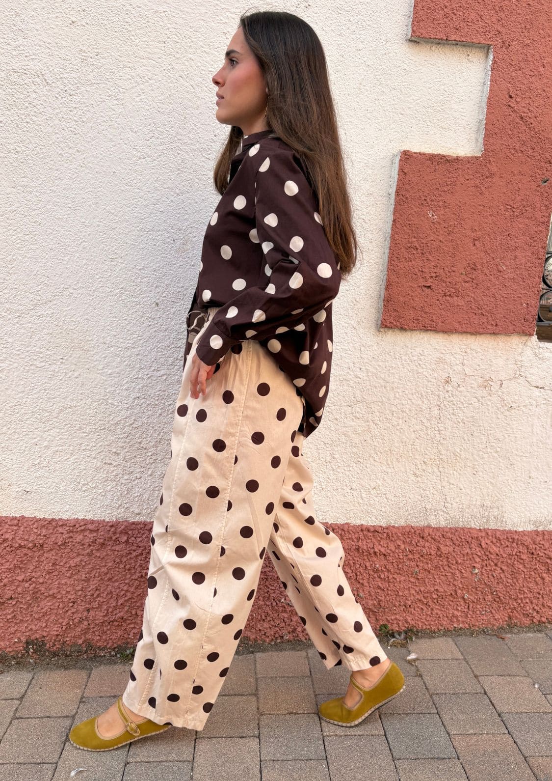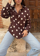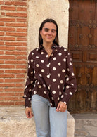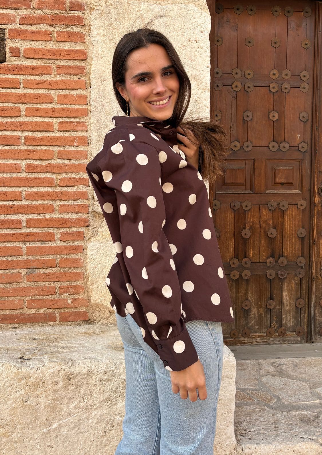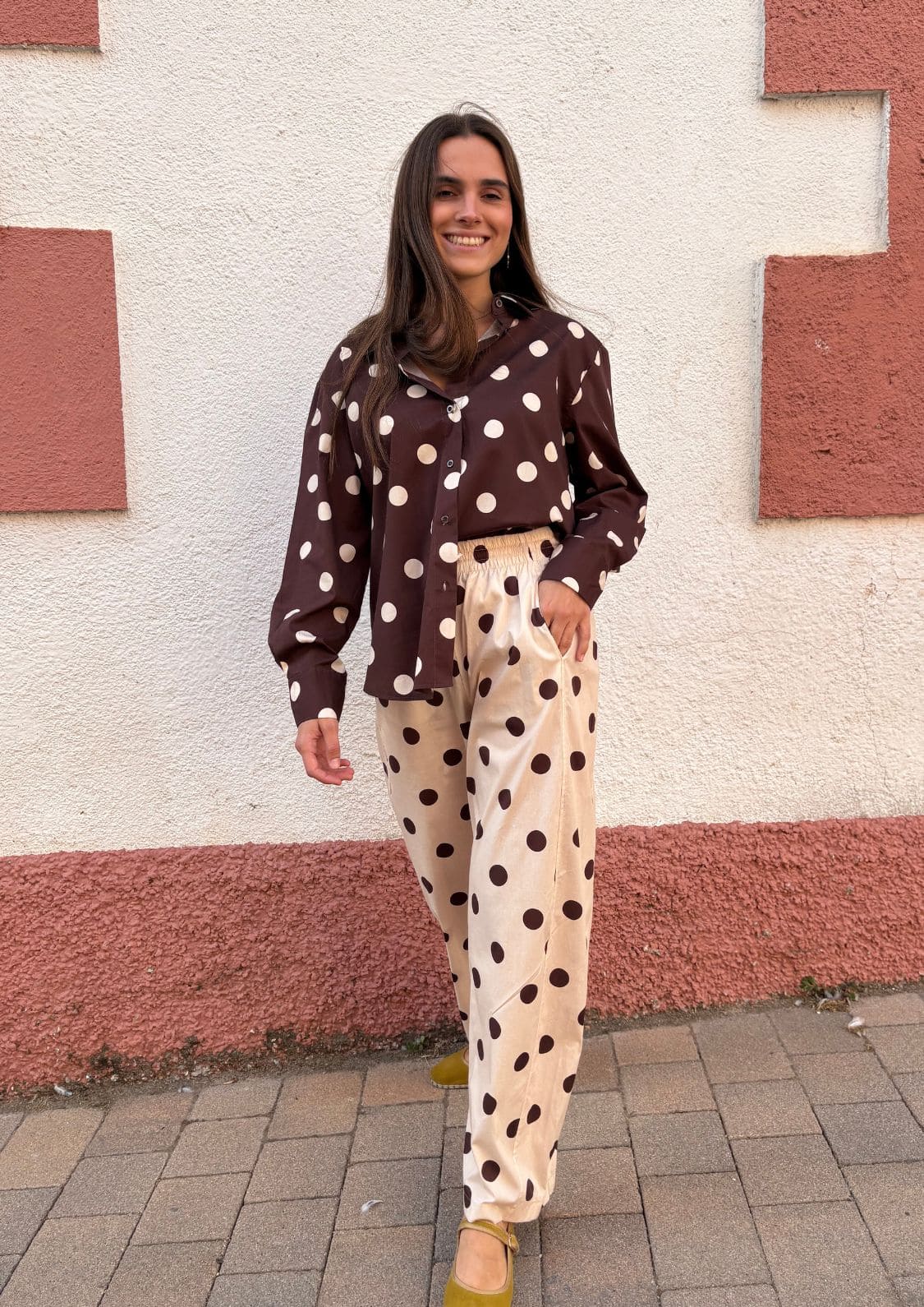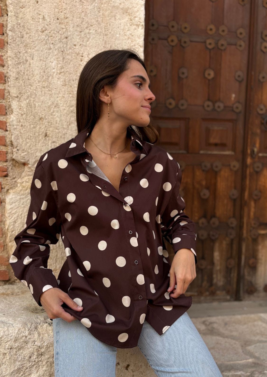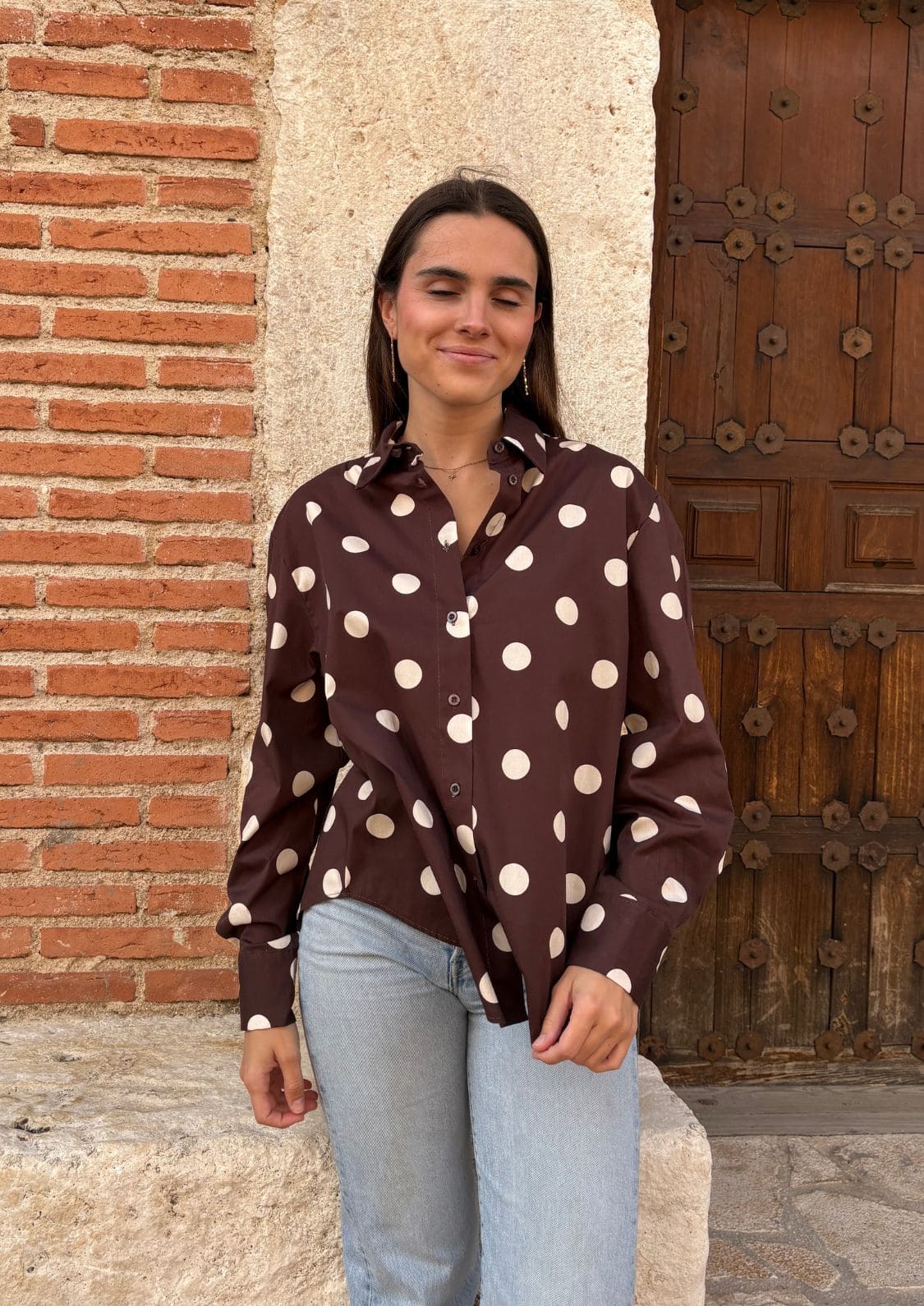 Esta camisa en tono marrón con estampado de lunares beige aporta frescura y sofisticación a cualquier look. Su diseño de corte recto y ligero se adapta con comodidad, mientras que el cuello camisero y el cierre de botones aportan un aire atemporal y versátil.