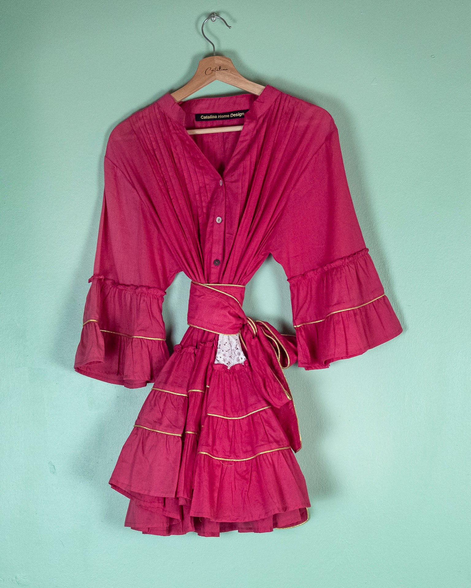 Vestido corto con manga tres cuartos, escote en V y cierre de botones. Decorado con volantes adornados con ribete dorado. MATERIAL: 100% Algodón. ORIGEN: India. COLECCIÓN: 2025 by Catalina. CUIDADOS: Lavar a mano/ No usar secadora / No usar legía / Planchado suave.