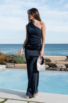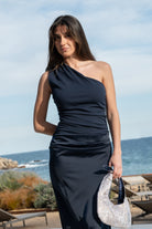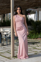 Vestido largo de escote asimétrico. Aplicación de drapeada en parte superior del vestido y en cadera. Detalle de corte asimétrico en cadera. Cierre con cremallera invisible en lateral izquierdo y snap que une el top con la falda.