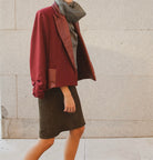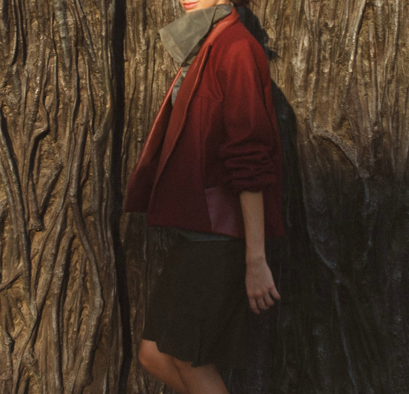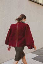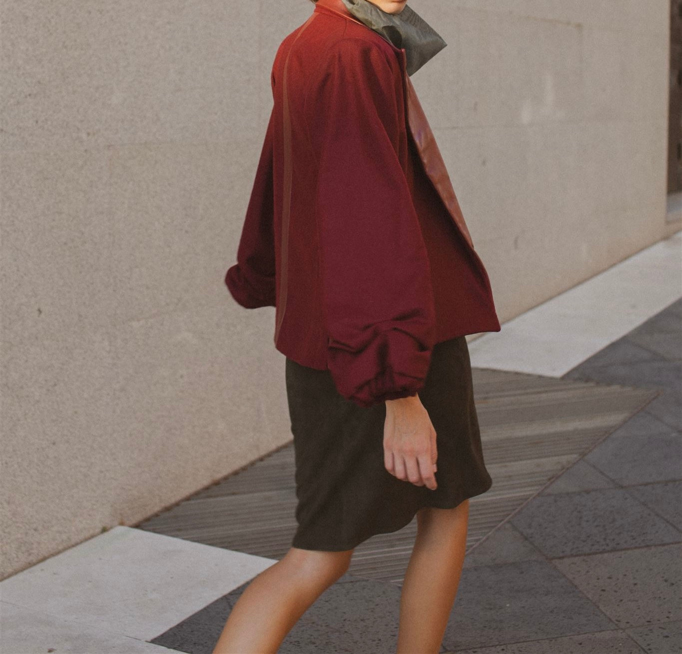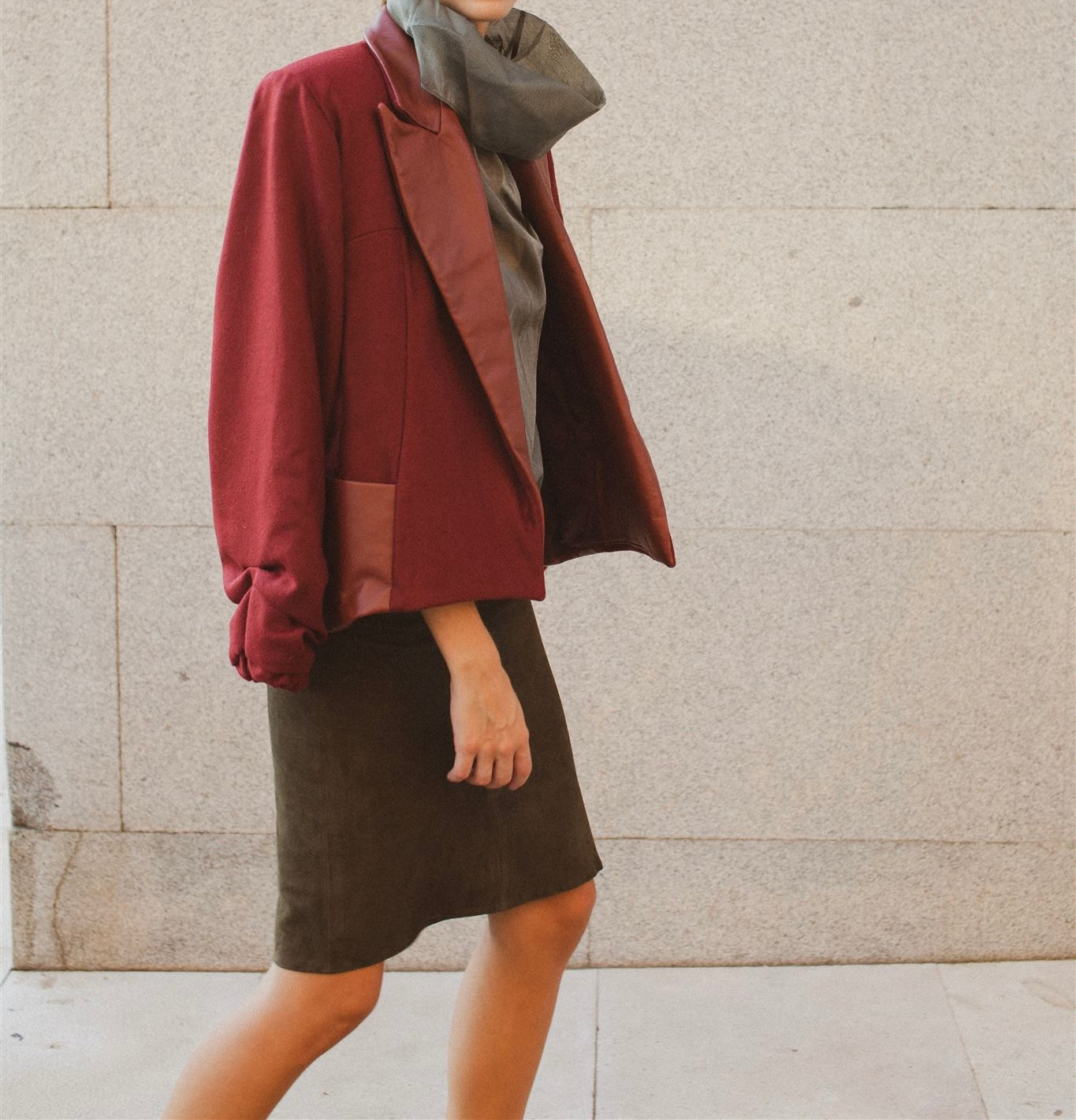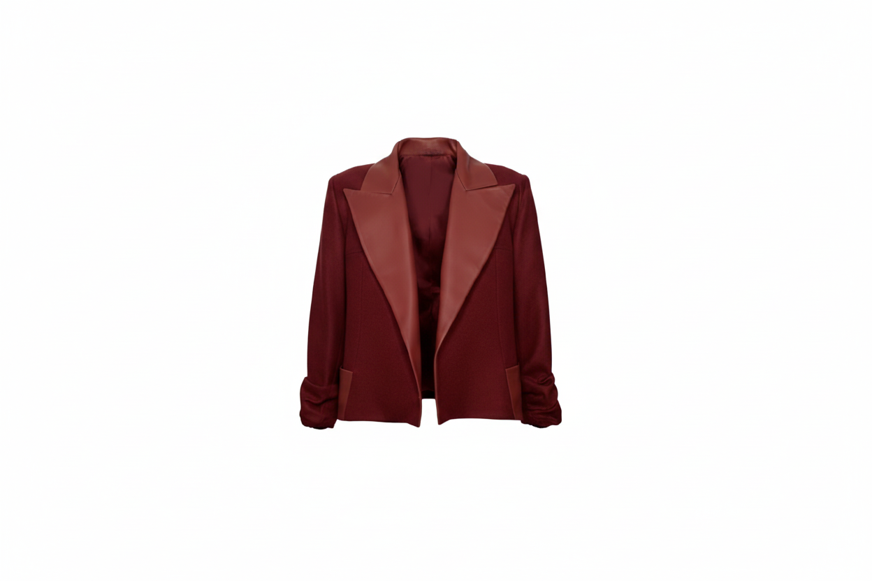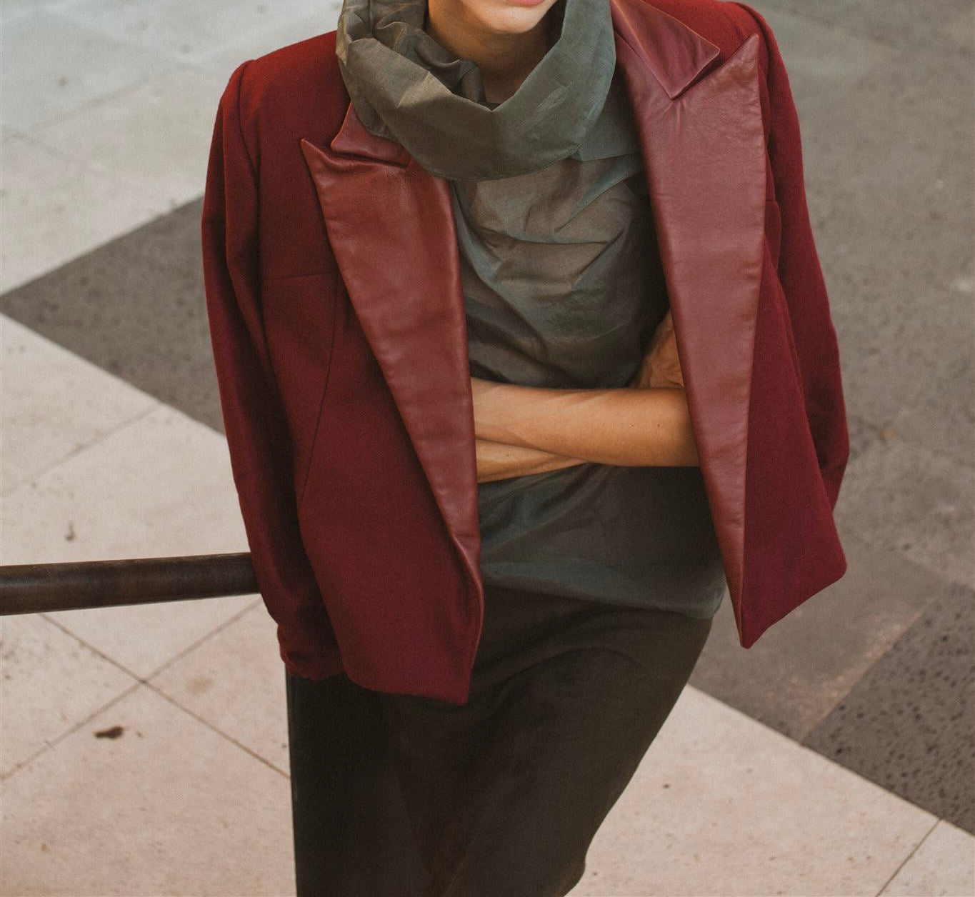 Firme y elegante, Maura impone sin esfuerzo. Como el faro que inspira su nombre, esta americana transmite presencia con silencio. La combinación de piel y lana en tono burdeos da lugar a una prenda estructurada, rica en textura y matices.