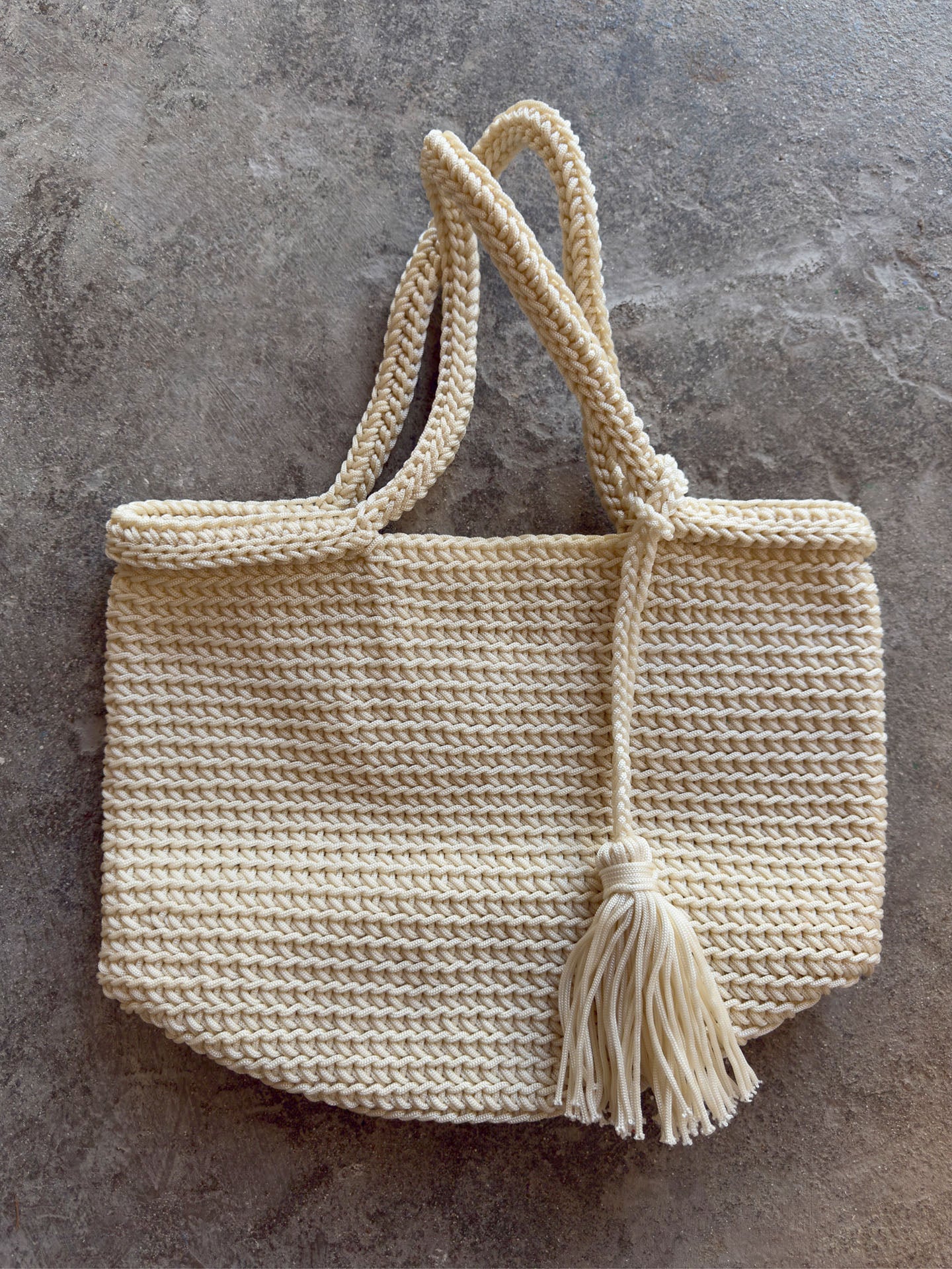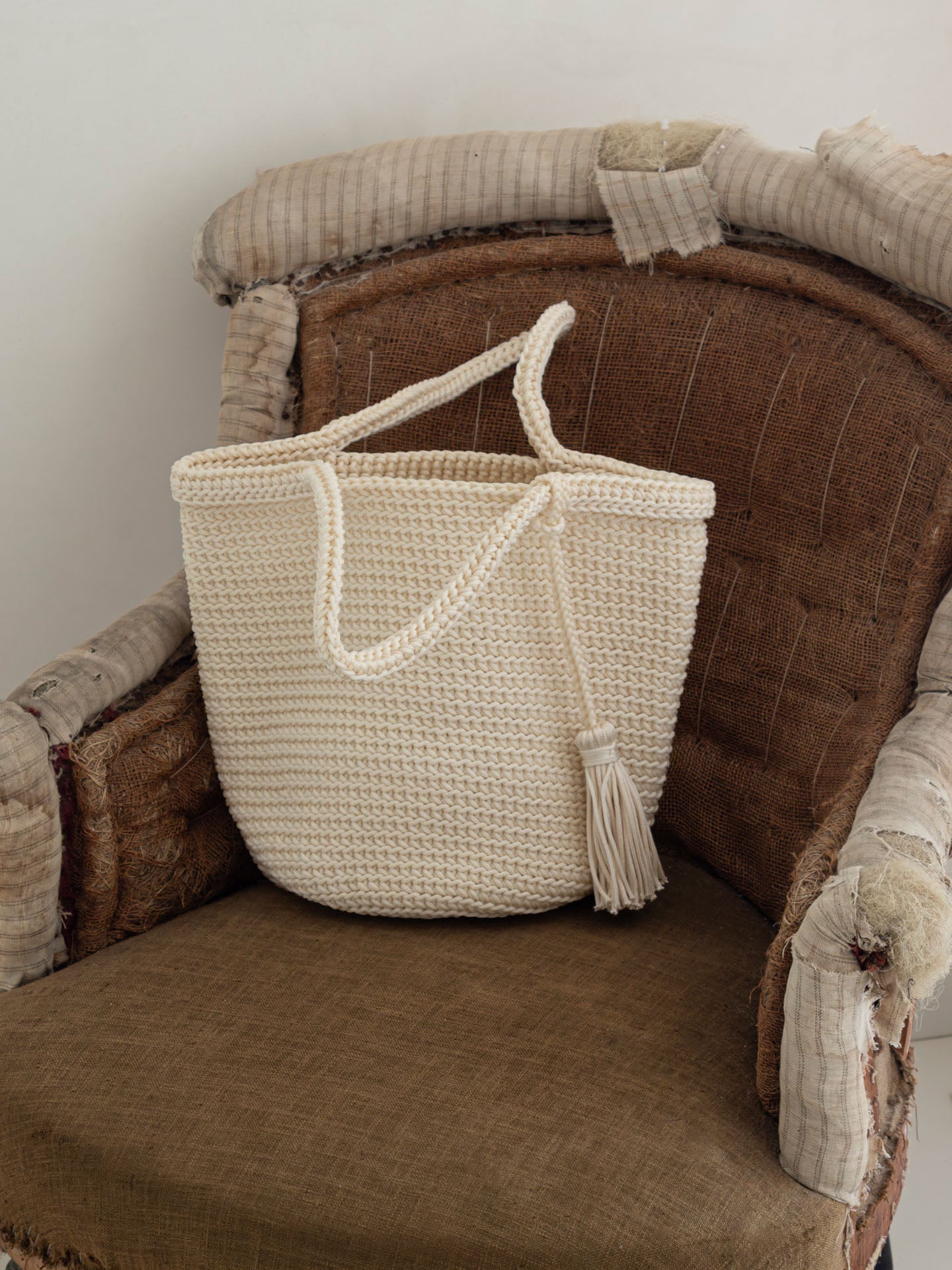 Bolso realizado a mano con la técnica de crochet. MATERIAL: Cuerda Sintética. MEDIDA: 27x37cm. ORIGEN: Marruecos. COLECCIÓN: Catalina Socias 2026. CUIDADOS: Limpieza delicada / No sumergir