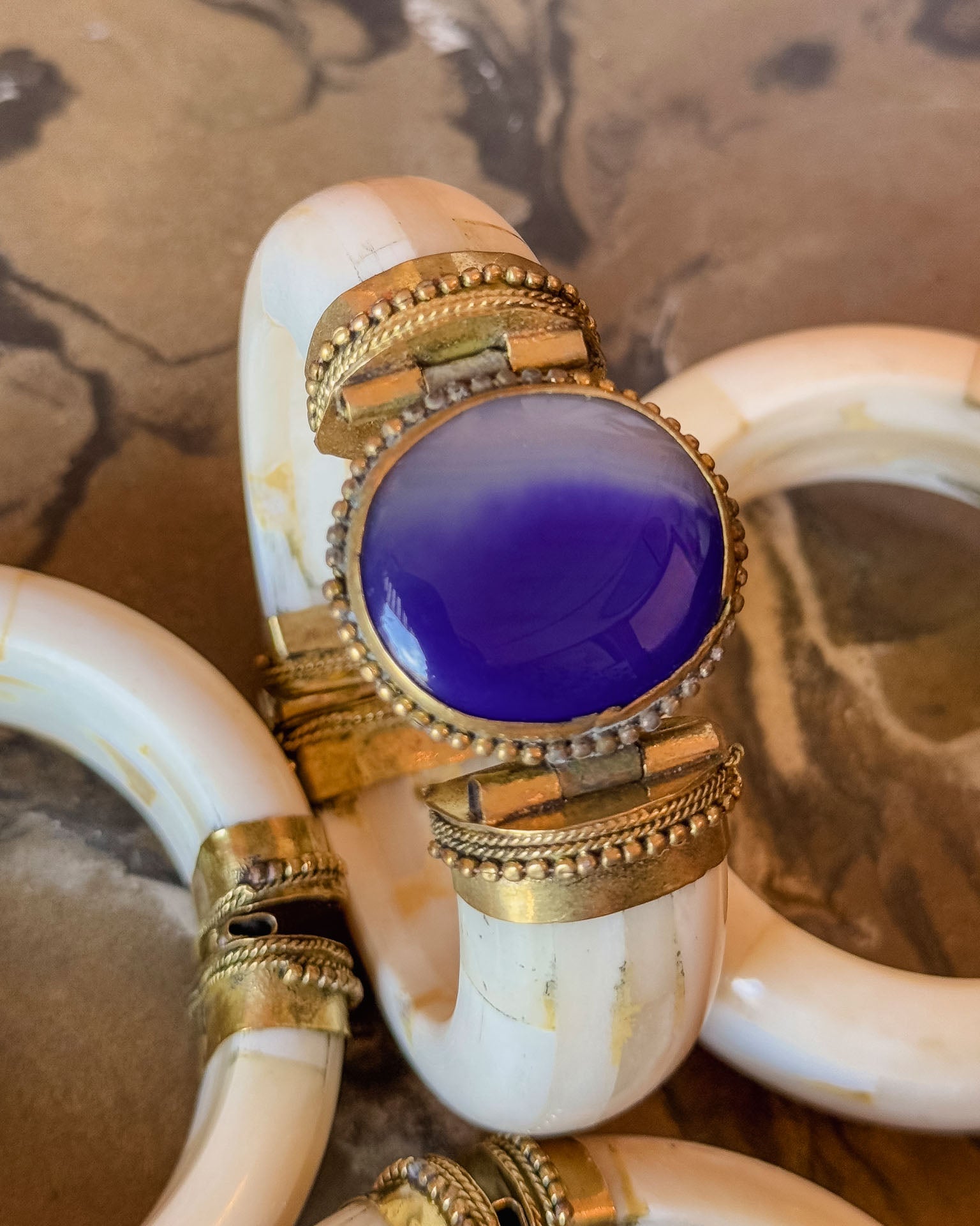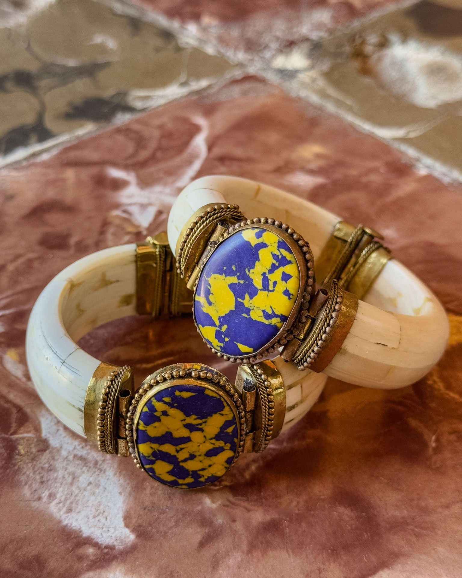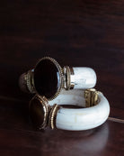 Pulseras de aspecto antiguo hechas a mano con colores variados (Todas diferentes) MATERIALES: Hueso sintético / Piedra sintética / Latón. MEDIDAS: Diámetro interior 6cm aproximadamente. ORIGEN: India.