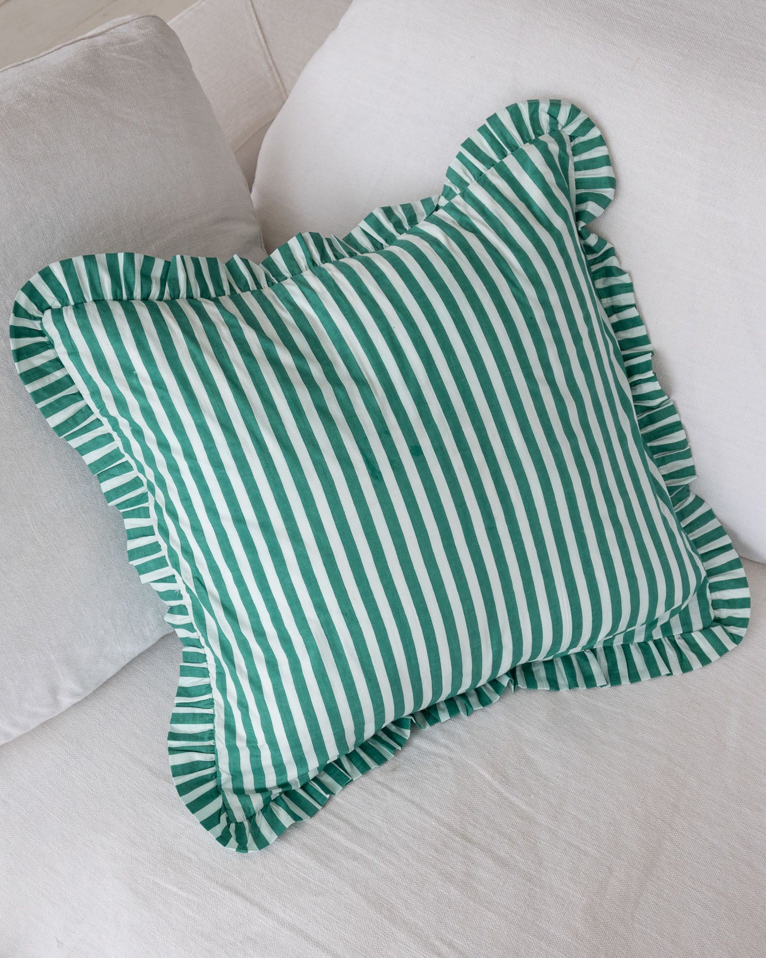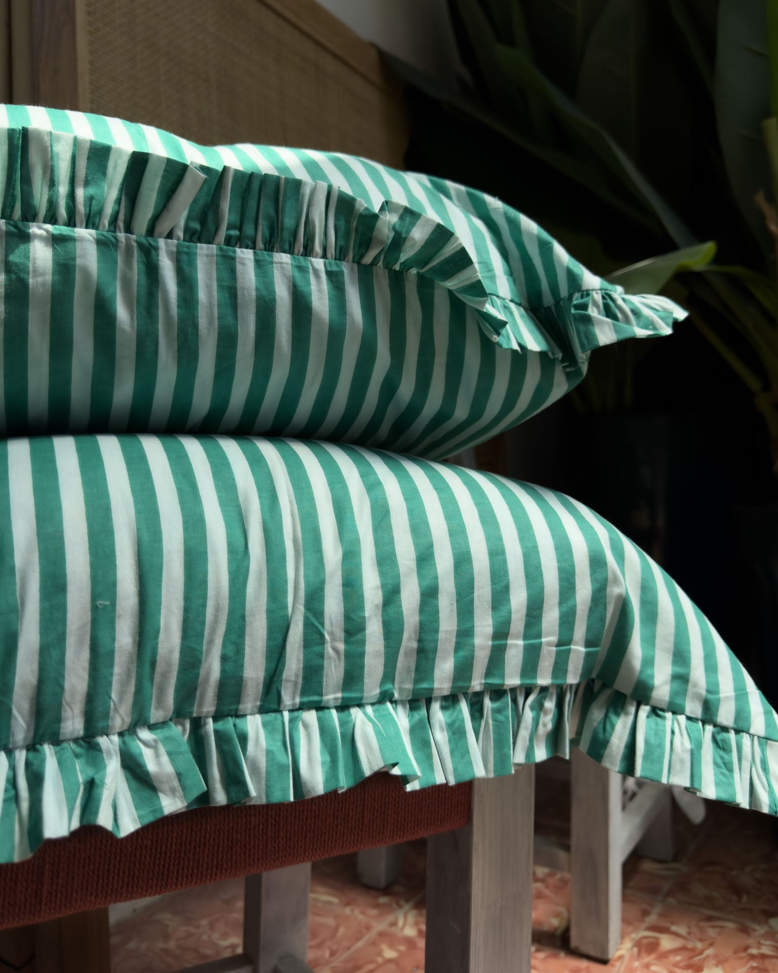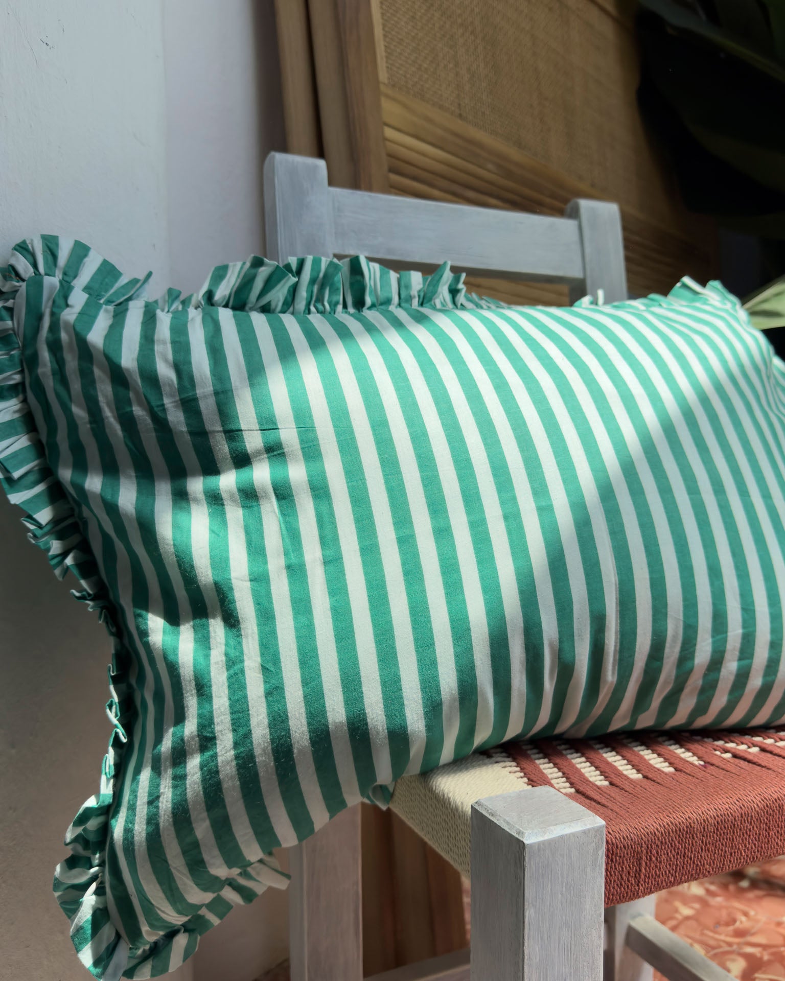 Funda de cojín decorada con volantes en estampado de rayas - MATERIAL: 100% algodón. ORIGEN: India. COLECCIÓN: 2025 by Catalina. CUIDADOS: Lavar a mano/ No usar secadora / No usar legítima / Planchado suave.
