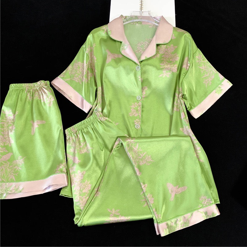 Pijama satinado de tres piezas de la colección Spring, diseñado para un estilo fresco, natural y elegante.