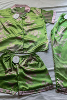 Confeccionado en satén suave y elástico, este conjunto en tono verde presenta un look ligero y armonioso, ideal para primavera, descanso o como regalo.