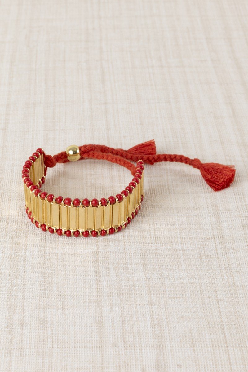 La reinterpretación del abanico en versión pulsera. Elaborada en latón con baño de oro, combina la fuerza del metal con la frescura del cordón de color, creando una pieza equilibrada y contemporánea. Ideal para llevar sola o combinada con el choker a juego, aporta luz y personalidad con un gesto sutil.