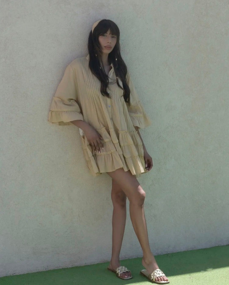 Vestido corto con manga tres cuartos, escote en V y cierre de botones. Decorado con volantes adornados con ribete dorado. MATERIAL: 100% Algodón. ORIGEN: India. COLECCIÓN: 2025 by Catalina. CUIDADOS: Lavar a mano/ No usar secadora / No usar legía / Planchado suave.