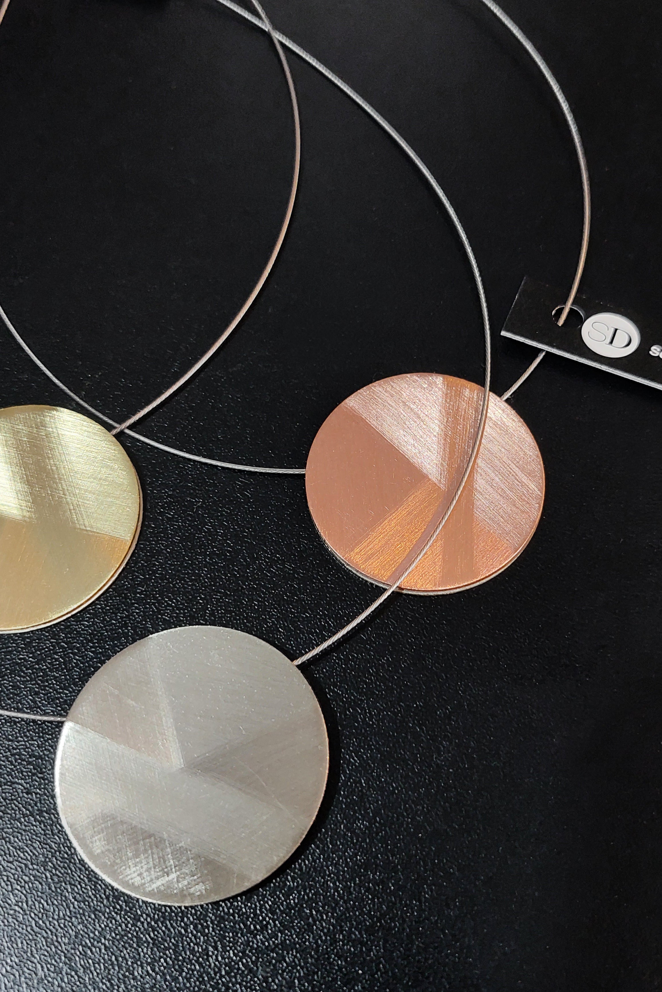 Collane reversibili. Texture rifinita a mano, segno distintivo del marchio. Tutti i pezzi sono laccati per una finitura brillante e resistente. Cordoncino in acciaio inossidabile lungo 46 cm.