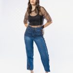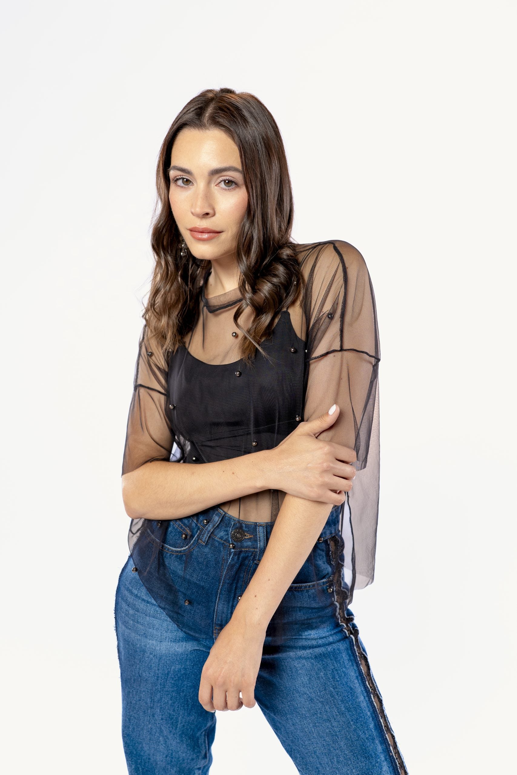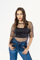 Blusa de malla transparente negra stretch con apliques brillantes tipo disco, con top negro interno. Juvenil y atrevido, ideal con jeans de tiro alto, shorts o faldas. La prenda ideal para destacar en fiestas, salidas nocturnas o looks modernos con blazer.