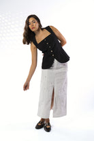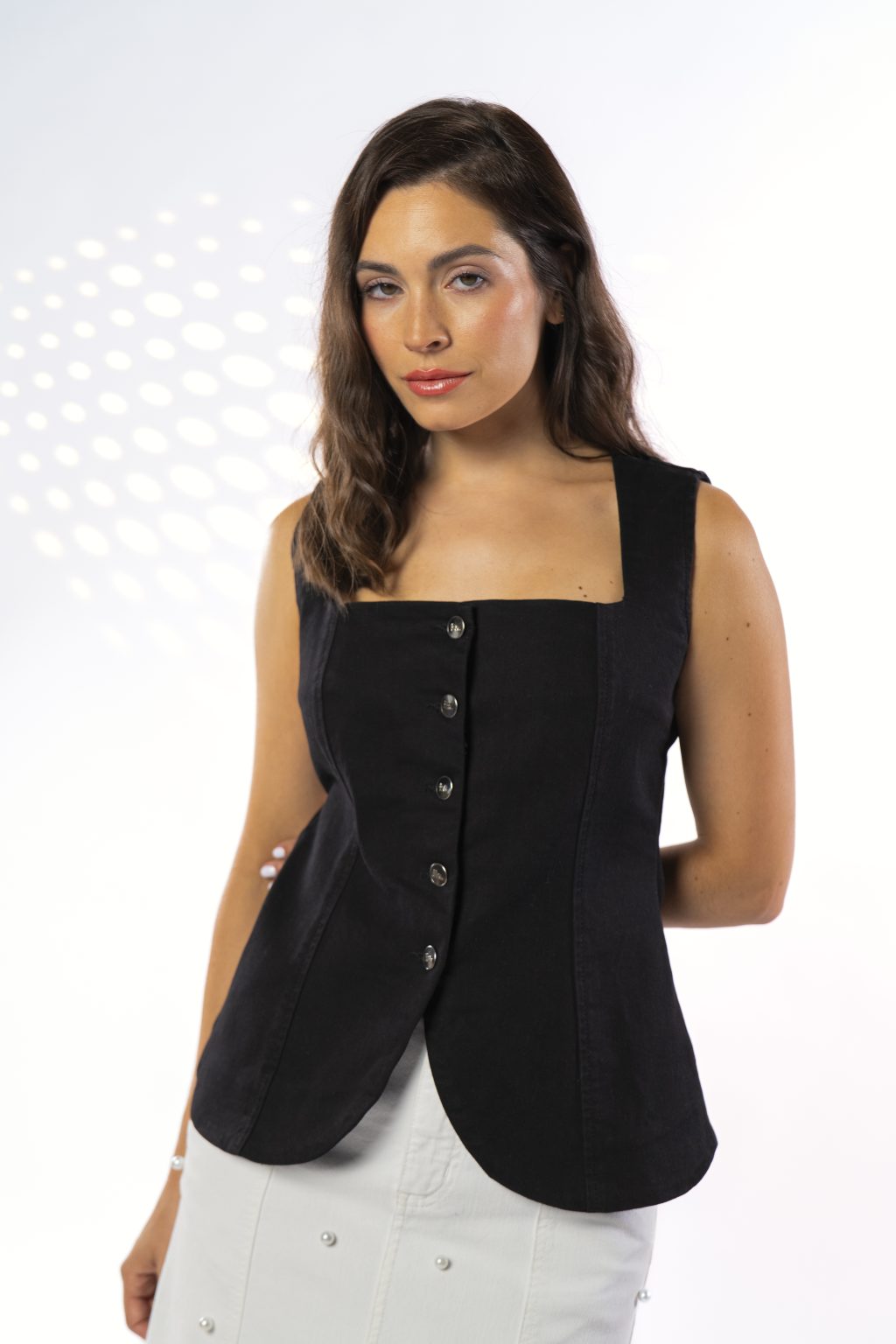 Chaleco confeccionado en black denim con acabado de terciopelo con suavidad al tacto. Diseño recto con escote cuadrado y botones metálicos dorados, aportando un estilo clásico, confortable con un twist de modernidad. Una prenda versátil para realzar cualquier outfit. Puede usarse solo como top elegante, sobre camisas blancas para un look formal o combinado con jeans para un estilo casual-chic.