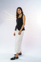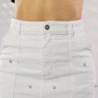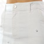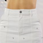Falda midi de tiro alto, silueta recta, confeccionada en tela denim blanca stretch. Sus detalles de apliques de perlas, la convierten en una prenda elegante y femenina, perfecta para ocasiones casuales con estilo.