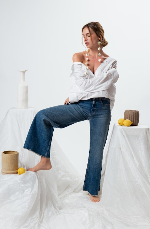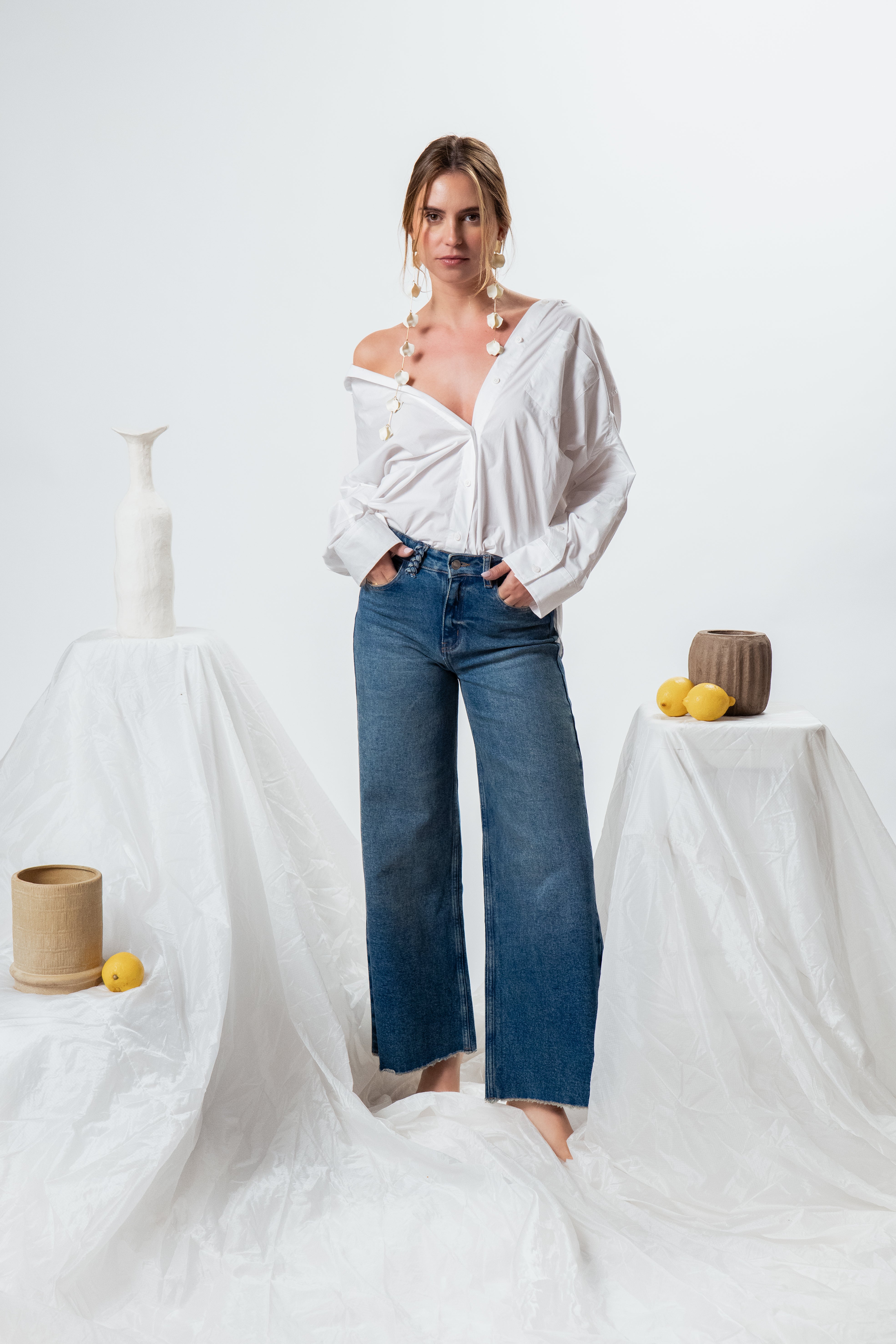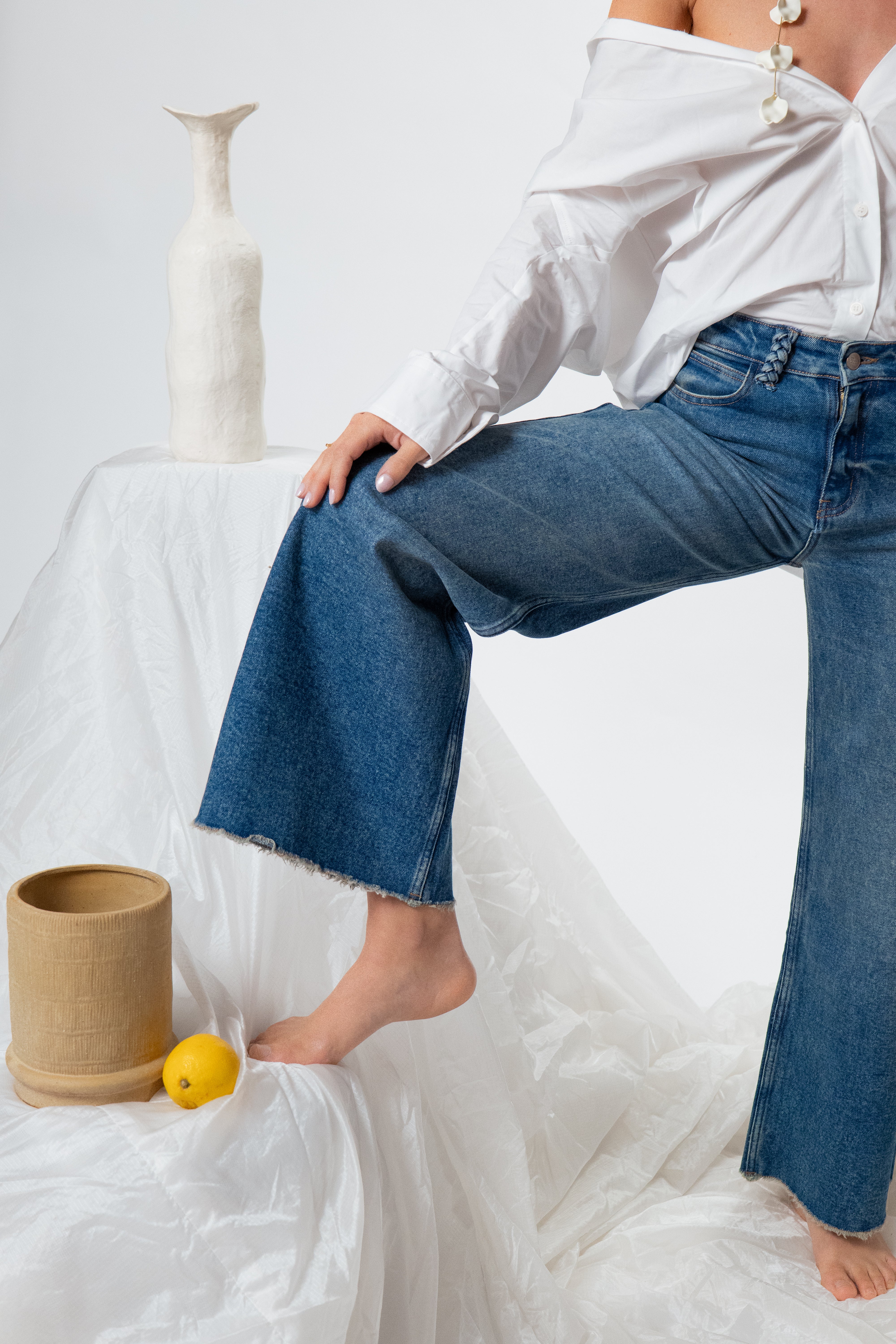 Su diseño amplio desde la cadera estiliza la silueta y se adapta al cuerpo, alargando visualmente. Un detalle único de este pantalón es la trenza que adorna el pasador, añadiendo originalidad y sofisticación.