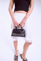 Minibag de tamaño pequeña. Posee cierre y bolsillo interior