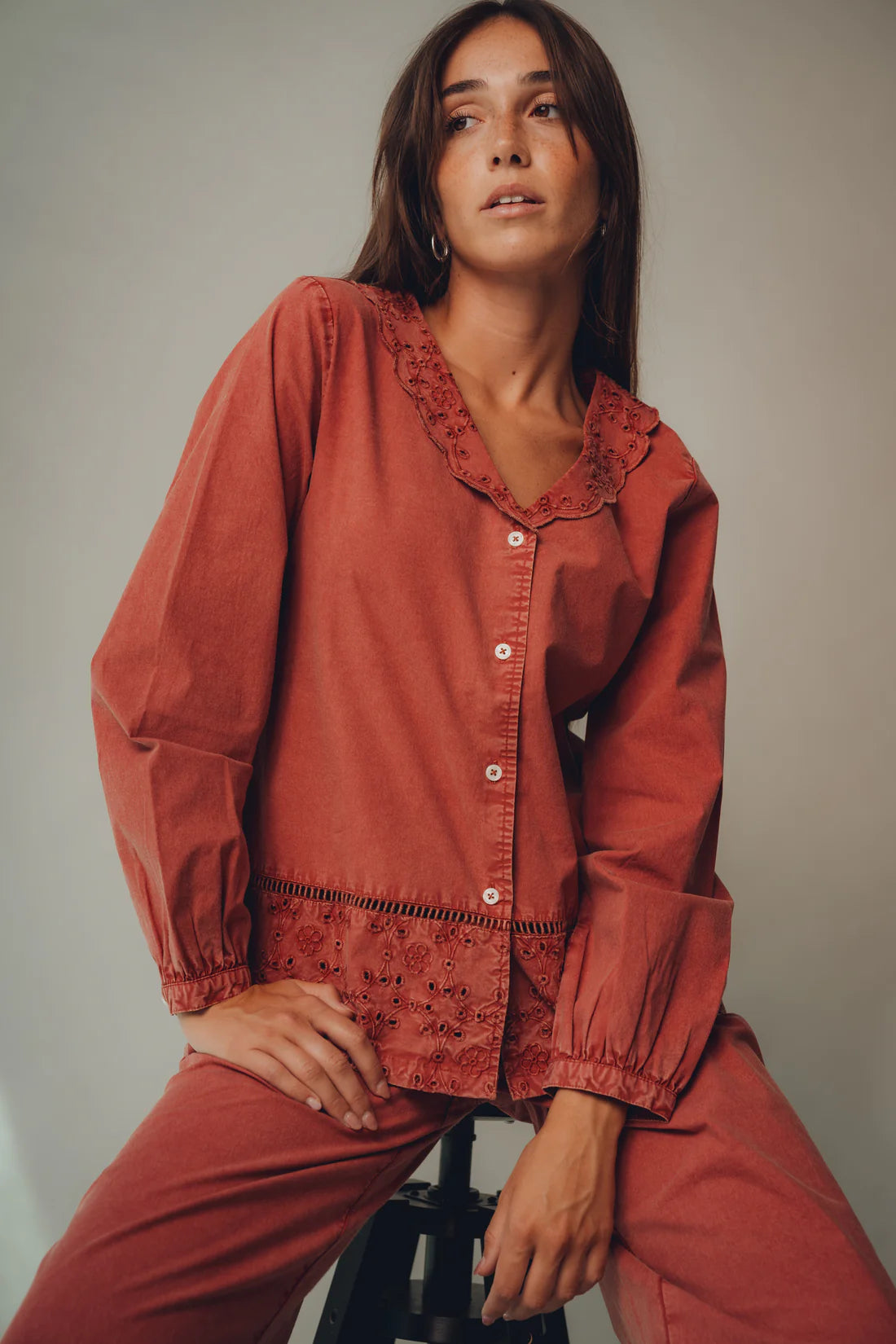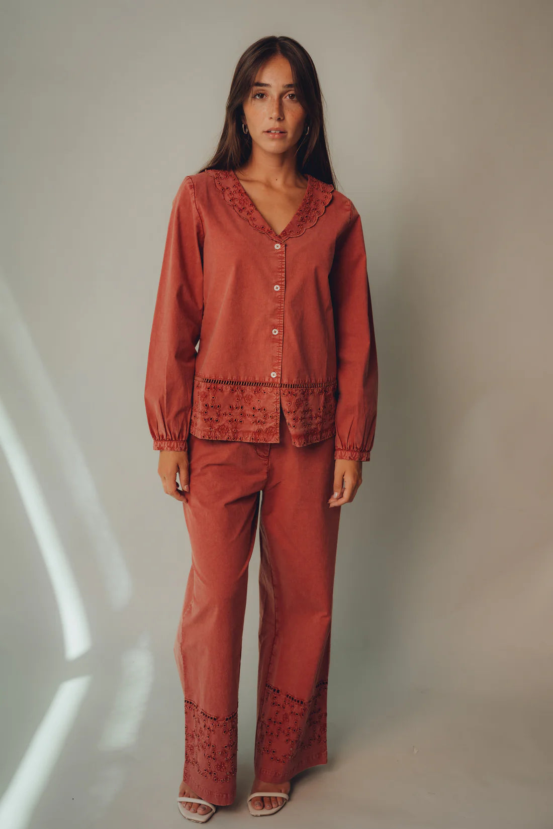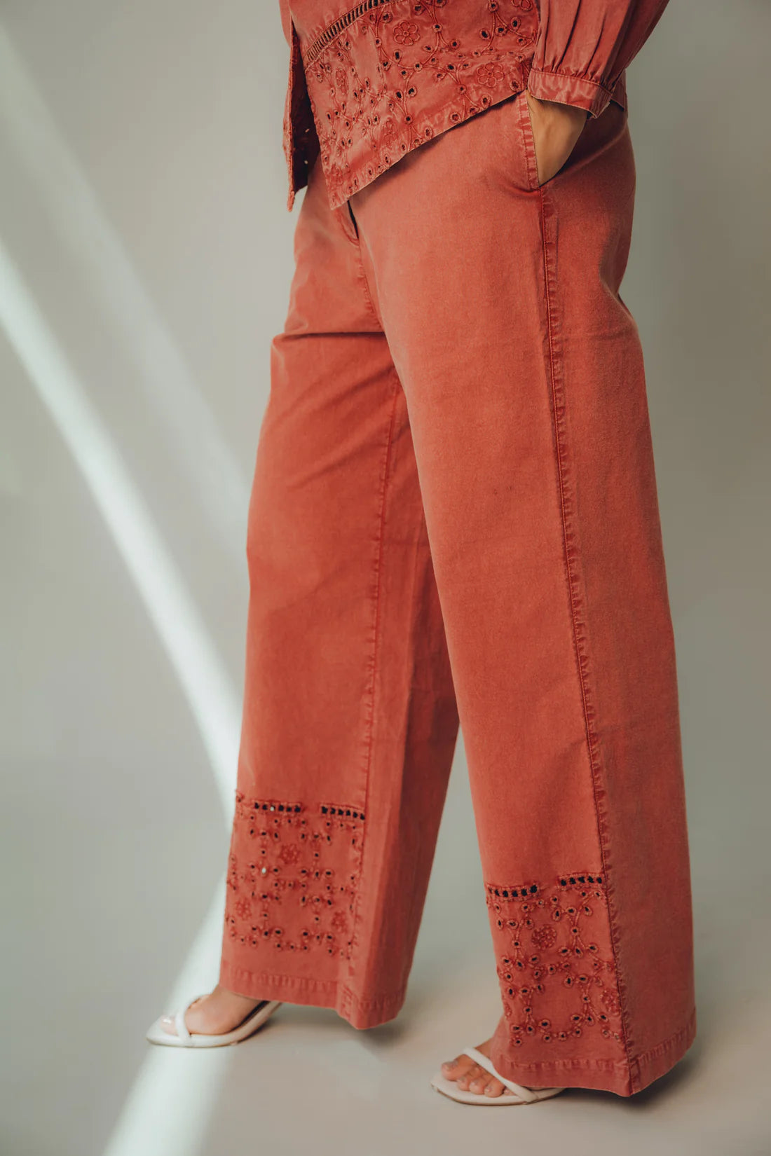 Este pantalón recto destaca por sus detalles sofisticados de calado en la parte inferior, que añaden un toque de elegancia sutil. Con dos bolsillos, un diseño cómodo y ligero, es una pieza muy fácil de llevar y combinar.