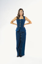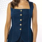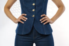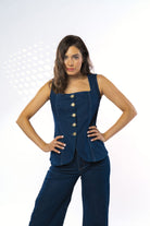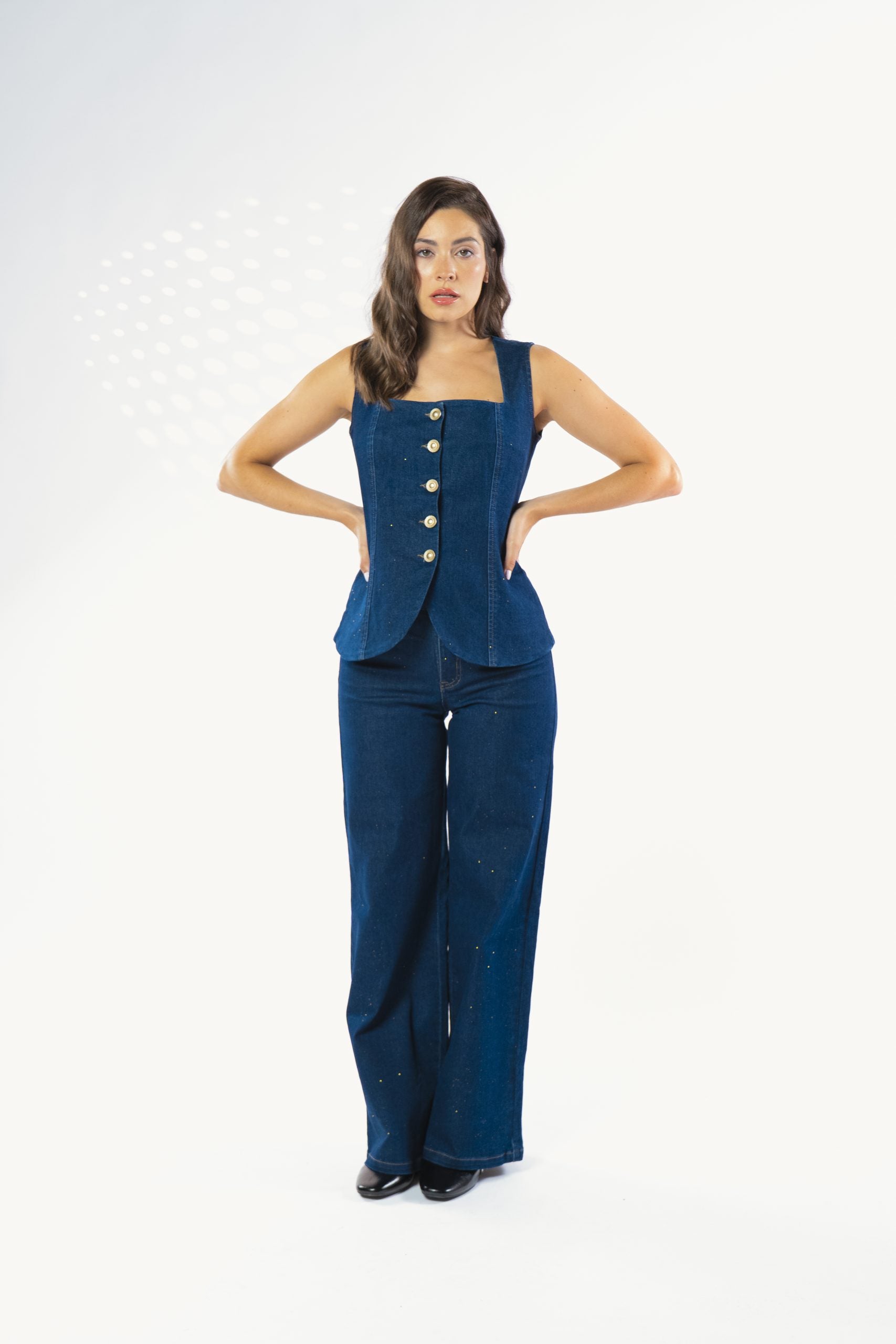 Chaleco en tela denim azul oscuro con elastano y acabado escarchado. Corte entallado con cuello cuadrado y botón frontal en dorado, que le da un acabado elegante y moderno. Funciona muy bien en conjunto con el Polvo de Estrellas Wide Leg para un look coordinado total denim.