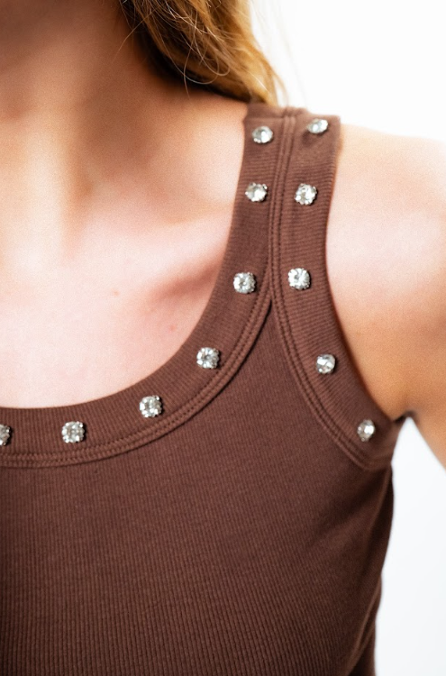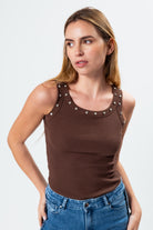 Esta blusa tiene un diseño moderno y elegante que se ve realzado por los apliques de taches en el cuello, que añaden un toque audaz y sofisticado. Su ajuste ceñido resalta la figura, mientras que su color cálido la hace fácil de combinar con diferentes prendas.