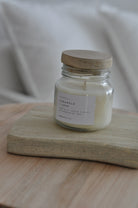 Vela de vidrio con tapa de madera en kiri hecha a mano. Aroma caramelo y café.