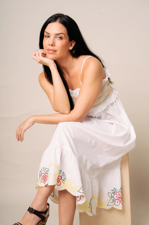 Este vestido blanco de algodón presenta un delicado bordado floral en la parte inferior, añadiendo un toque de elegancia a su diseño sencillo. Con su estilo fresco y cómodo, es perfecto para el día a día, brindando una apariencia sofisticada y femenina.
